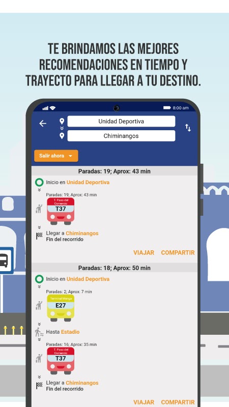 Рассчитывает маршрут Origin — Destination, чтобы добраться в любой точке в системе с меньшим количеством станций и меньше остановок перегрузки. Вы можете выбрать дату и время, на котором вы хотите, чтобы совершить поездку, так что вы можете спланировать свою поездку раньше. Для каждого автобуса раз показаны и активные графики выделены. Вы также можете заказать услугу такси, чтобы ускорить движение.