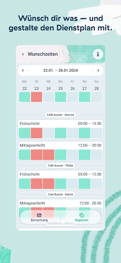 Откройте для себя Gastromatic — ваше новое любимое приложение для работы. Ваше расписание, рабочие часы, отпуск и многое другое теперь у вас под рукой всего одним кликом. Панель управления предоставляет обзор всей важной информации, позволяет просматривать следующее задание в календаре и подавать заявки на доступные смены. Больше никаких беспокойств и суеты. Чёткий взгляд в будущее!