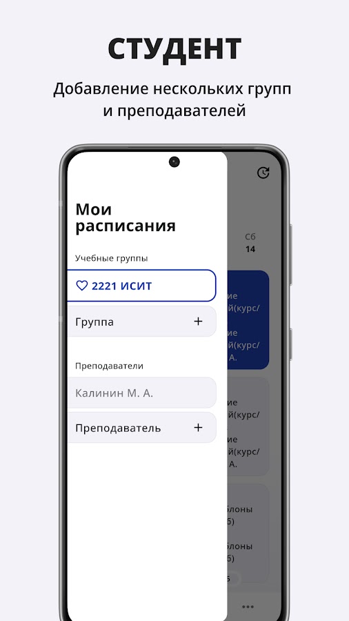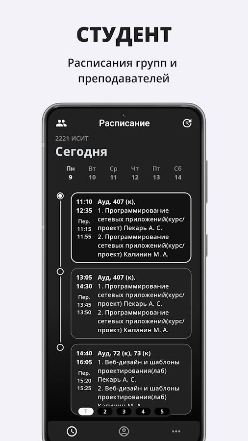 — Расписание занятий: просмотр расписания учебных групп и преподавателей с возможностью сохранить несколько групп и преподавателей.