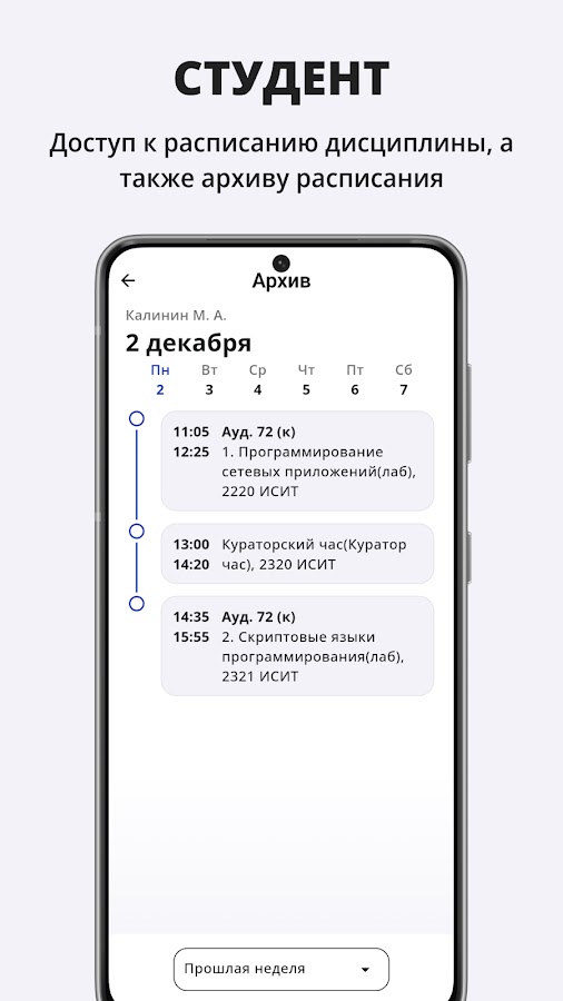 — Архив расписания: доступ к предыдущим расписаниям групп и преподавателей.