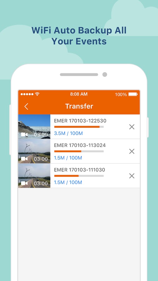 Когда происходит происшествие, видеорегистратор автоматически сохраняет файл в папке событий и отправляет отснятый материал в приложение MiVue™ Pro через WIFI в режиме реального времени (функция резервного копирования видео WIFI не будет использовать ваши данные 3G/4G, она использует точку технология передачи «точка-точка»).