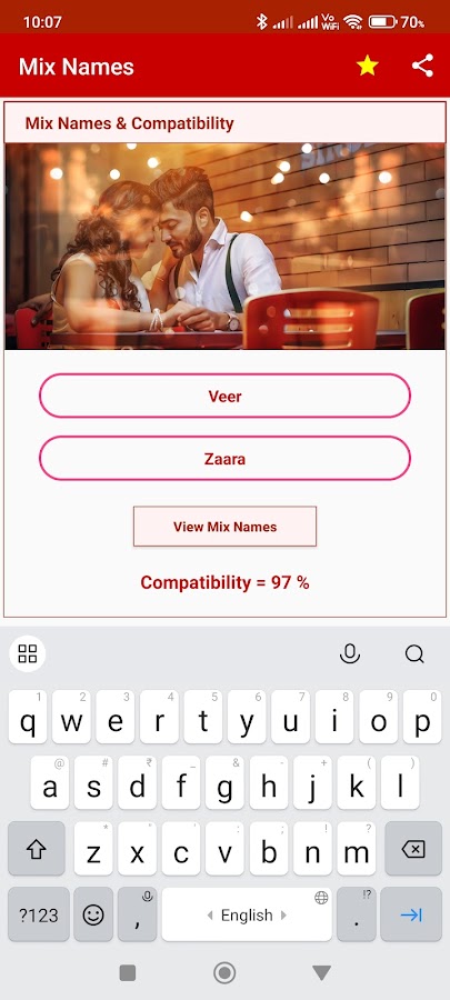 — Проверьте процентную оценку совместимости любви между двумя именами.