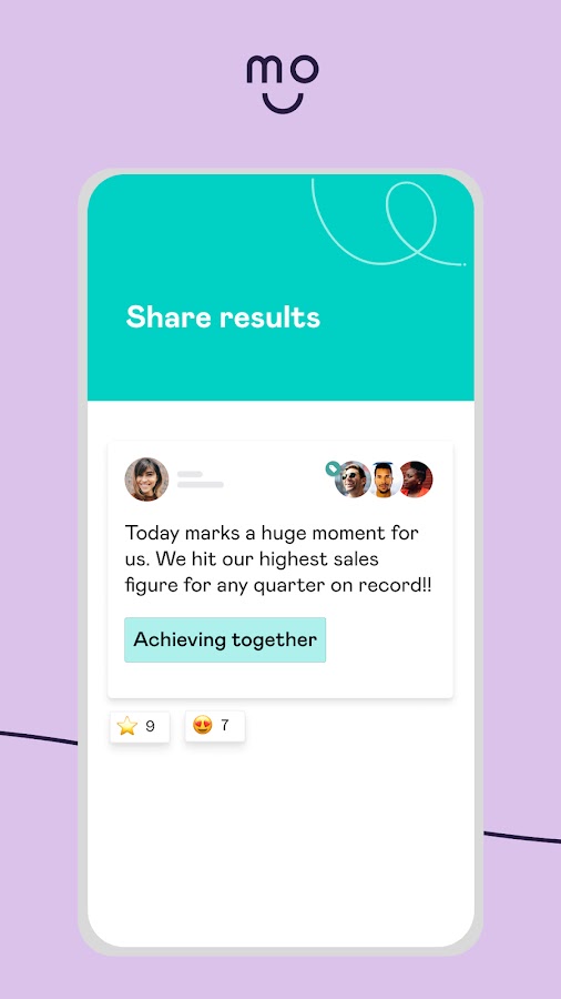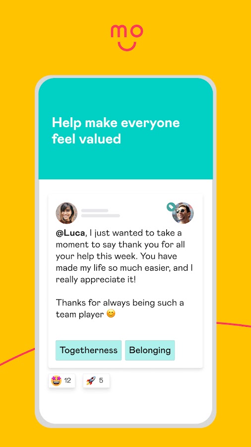 Mo — это приложение для признания и вовлечения сотрудников, где вы можете делиться моментами со своими коллегами. Место, где вы можете оценить удивительные достижения тех, с кем вы работаете каждый день. Мо поможет вам укрепить отношения с вашей командой, поделиться идеями о том, как сделать работу лучше, и получить вознаграждение за дополнительные усилия.