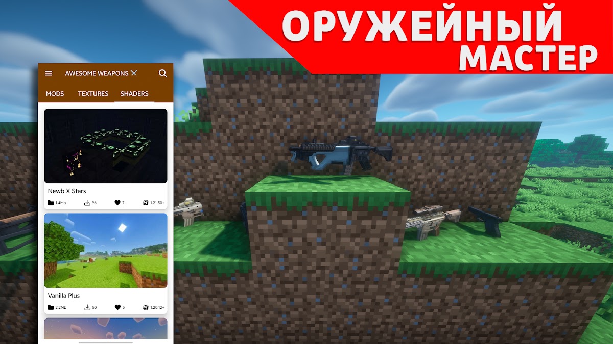 Новые моды на оружие для Майнкрафт теперь доступны каждому игроку. Прокачай свой Minecraft PE вместе с Оружейный Мастер для Майнкрафт ПЕ! Открывай, скачивай и устанавливай крутые моды, текстуры высокого разрешения и впечатляющие шейдеры — всё бесплатно и всего в одно касание. Охоться на криперов из эпического оружия прямо сейчас.