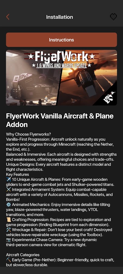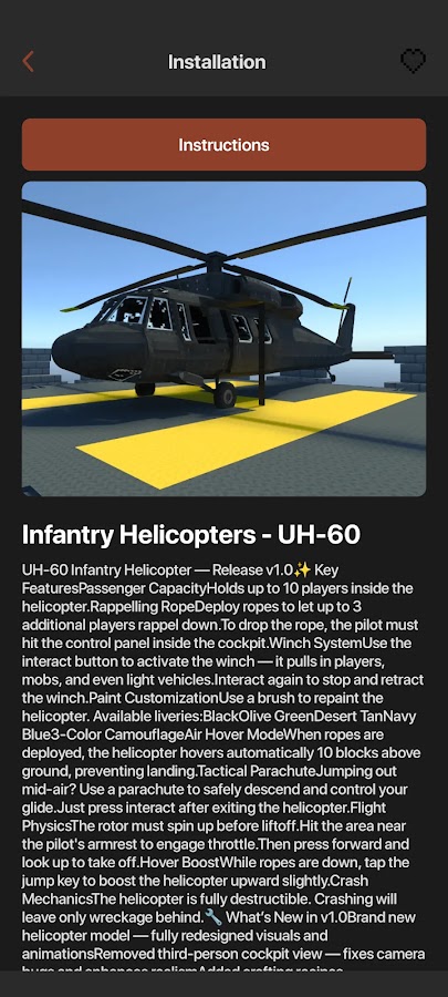 Приложение «Моды на вертолёты и самолёты для Майнкрафт ПЕ» добавляет в игру авиацию и воздушный транспорт. В него входят аддоны и модификации, позволяющие использовать разные летательные аппараты — от гражданских самолётов и лёгких вертолётов до истребителей, бомбардировщиков и современных дронов. Игрок может управлять техникой, исследовать небо и открывать новые возможности для игрового процесса.