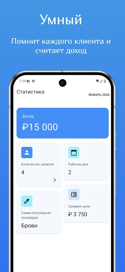 Также Вам будет доступна функция напоминания о предстоящей записи и статистика по месяцам!