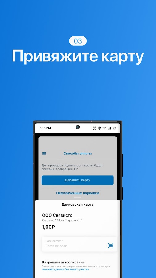 Авторизация пользователей осуществляется по номеру телефона. Пользователь регистрирует номер своего транспортного средства в приложении, привязывает банковскую карту.