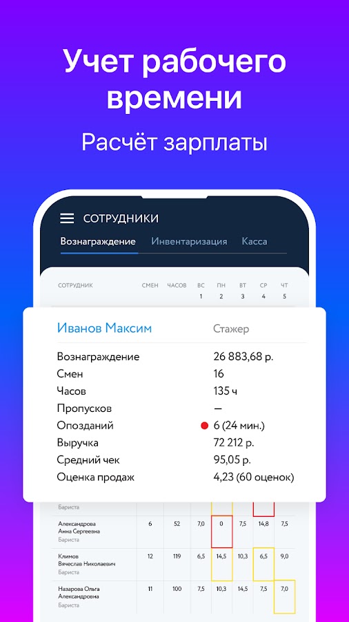 — добавлять несколько сотрудников в смену (табелирование);