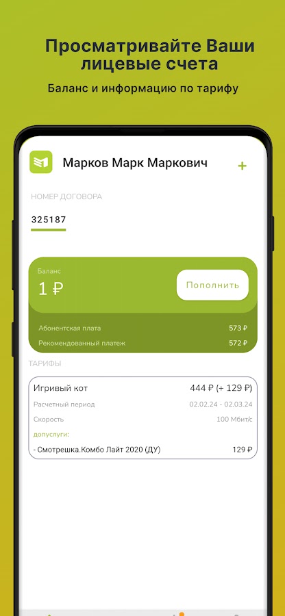 • Просмотр состояния баланса, стоимость ежемесячного платежа
