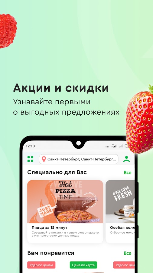 Соберём свежие продукты, бережно упакуем и доставим бесплатно от 30 минут. Ежедневно до полуночи.