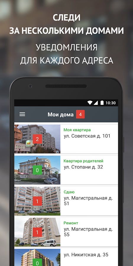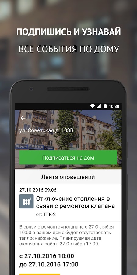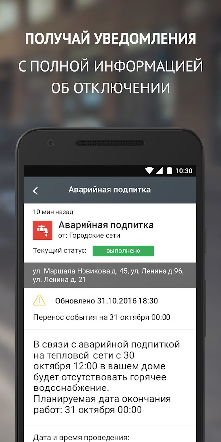 Узнавайте об отключениях электричества, отопления, холодной и горячей воды. В приложении всегда доступна актуальная информация по ремонтным работам для всего города. Подпишитесь на интересующие вас адреса и получайте звуковые уведомления с информацией по отключениям в вашем доме.