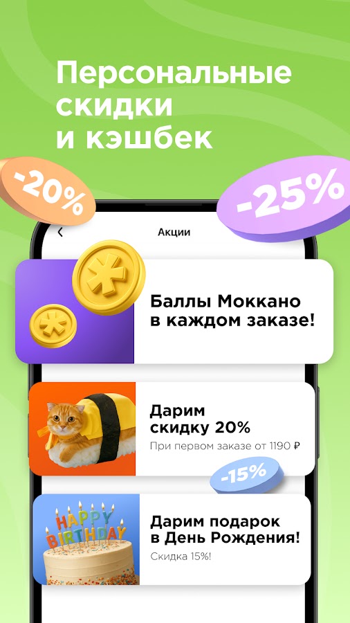 Регистрируйтесь в программе лояльности, чтобы получать много интересных предложений: блюдо за баллы, секретные промокоды, подарки на День Рождения, персональные скидки и рекомендации