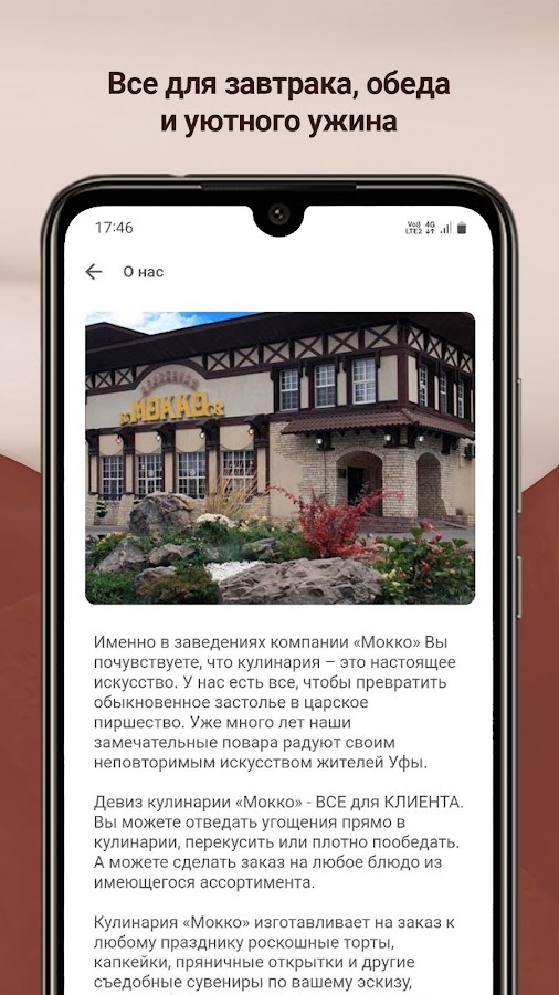 Именно в заведениях компании «Мокко» Вы почувствуете, что кулинария – это настоящее искусство. У нас есть все, чтобы превратить обыкновенное застолье в царское пиршество. Уже много лет наши замечательные повара радуют своим неповторимым искусством жителей Уфы. Девиз кулинарии «Мокко» — ВСЕ для КЛИЕНТА. Вы можете отведать угощения прямо в кулинарии, перекусить или плотно пообедать. А можете сделать заказ на любое блюдо из имеющегося ассортимента. Мы создали это приложение, чтобы дать нашим гостям новое измерение восприятия наших заведений: программа лояльности, всегда актуальные акции и меню. Что Вы найдете в этой версии: • Возможность получить карту лояльности сети «Мокко»: в этой версии мы обновили систему авторизации, сделав её более надежной (звонок + SMS). • Всегда актуальный статус Вашей карты: теперь помимо процента скидки отображается её описание и прогресс до следующего уровня. • Актуальное меню, список событий и акций. Мы намерены постоянно развивать это приложение, будем рады комментариям и пожеланиям!
