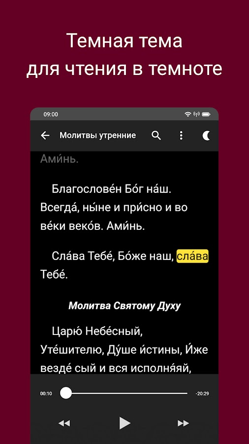 ・Уникальная подсветка слов позволяет следить за текстом во время прослушивания, помогает лучше понимать и запоминать молитвы.