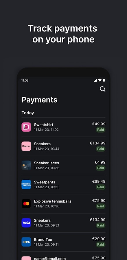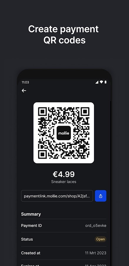 Приложение Mollie позволяет легко держать руку на пульсе вашего бизнеса, пока вы в пути. Получайте оплату лично, делитесь ссылками на оплату и получайте уведомления.