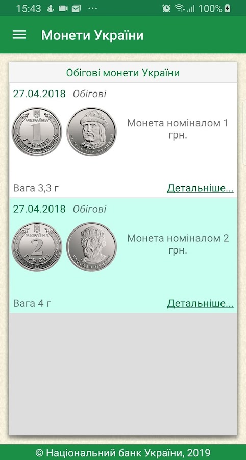 Пользователь приложения получает доступ к полному справочнику монет Украины, которые выпущены Национальным банком Украины, с просмотром технической информации, изображений монет, описания. В приложении есть поиск по названию, серии, металлу и годам выпуска.