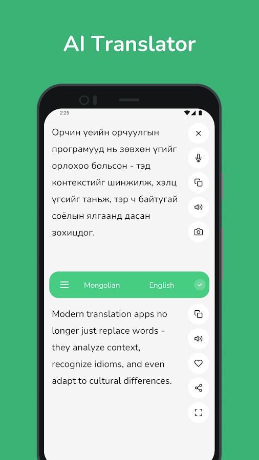 Благодаря нашему интуитивно понятному интерфейсу вы можете легко переводить слова, фразы и предложения с монгольского на английский в режиме реального времени. Наш продвинутый искусственный интеллект обеспечивает точные переводы, учитывая нюансы обоих языков.