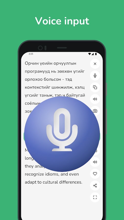 • Распознавание голоса: говорите прямо в приложении, и наш искусственный интеллект мгновенно переведет вашу речь, делая разговор более плавным.