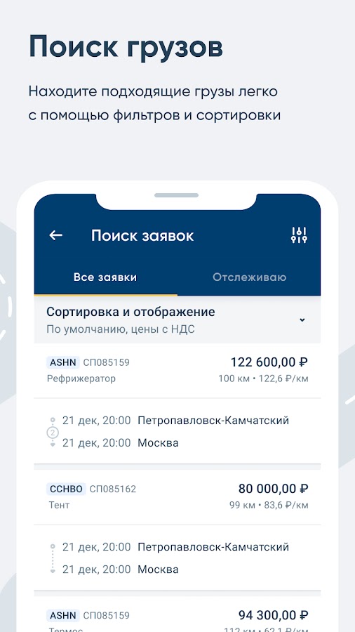 Используйте фильтры, чтобы выбрать нужное направление, тип прицепа и дату отправления. Выбранный груз можно взять в работу. Вам придет уведомление от грузовладельца с назначением на заявку.