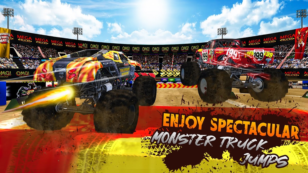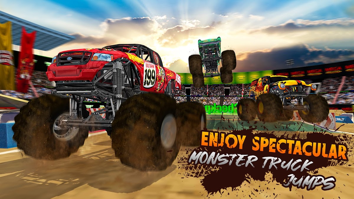 Гонки на грузовиках-монстрах в гоночных играх с усовершенствованным физическим движком для точной имитации трюков, гонок и новых 3D-звуковых эффектов гоночных игр.