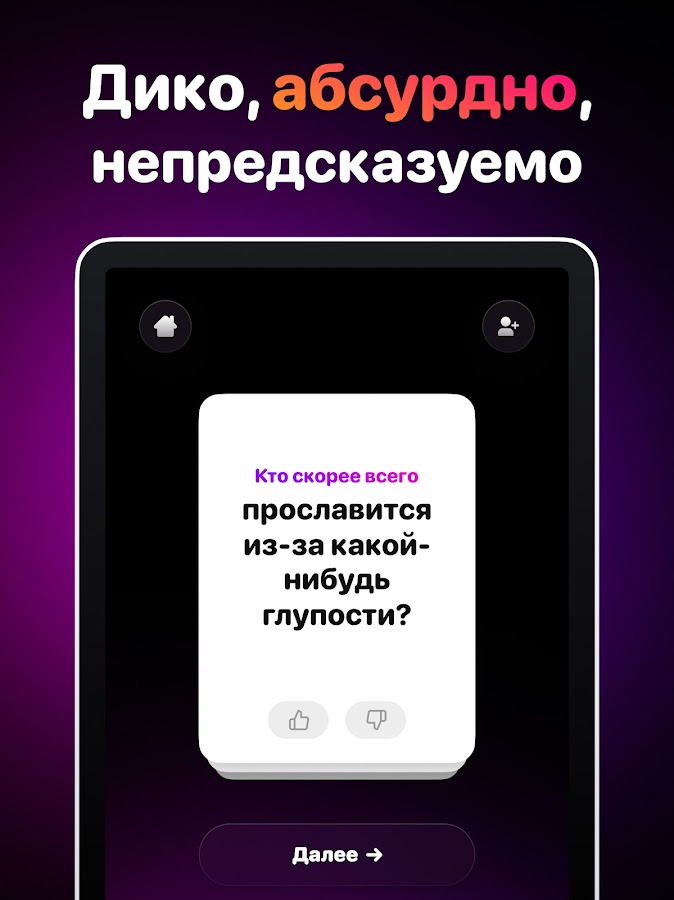 Most Likely To® — это дикая вечериночная игра для взрослых. Узнай, что друзья реально думают о тебе и кого они считают тем самым человеком, который с наибольшей вероятностью сделает что-то абсолютно абсурдное. Идеально подходит для домашних вечеринок, pre-party, студенческих тусовок и любых других встреч.