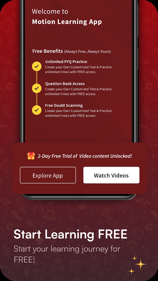 Отказ от ответственности: Представленные функции основаны на том, что доступно в настоящее время в приложении Motion Learning. Фактический опыт может отличаться в зависимости от вашего курса, плана или местоположения. Мы не гарантируем гарантированные оценки, успешную сдачу экзамена или конкретные результаты. Такие инструменты, как PYQ, видеолекции и помощь в решении вопросов, могут быть ограничены или меняться со временем. Представленная статистика и данные основаны на наших внутренних записях и могут включать данные прошлых лет. Компания Motion Education Private Limited не связана ни с одной организацией, проводящей экзамены.