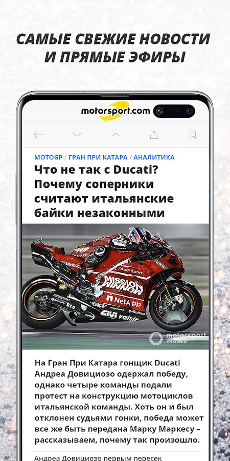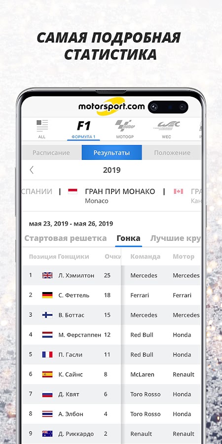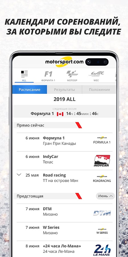 Лучший способ узнавать о событиях в мире авто- и мотоспорта — официальное приложение Motorsport.com с информацией о Формуле 1, MotoGP, Формуле Е, NASCAR, IndyCar, WEC, WRC, Формуле 2 и Формуле 3, WRX, DTM, WSBK, Moto2 и Moto3 в одном уникальном, но простом в использовании приложении. Скачайте бесплатно прямо сейчас!