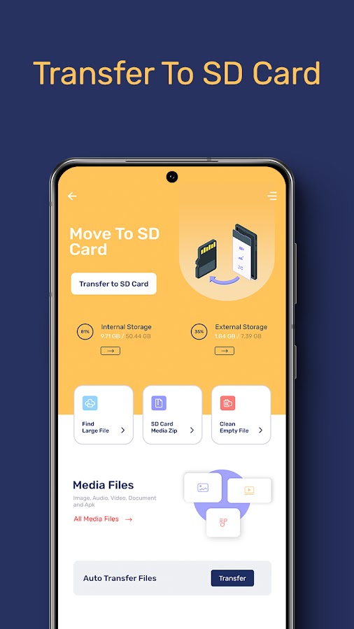 Переместите свои фотографии, видео, музыку, Zip-файлы и все другие загрузки из памяти телефона на SD-карту. Вам больше не нужно беспокоиться о нехватке внутренней памяти. Вы можете легко автоматически переносить файлы из внутренней памяти в память SD-карты.