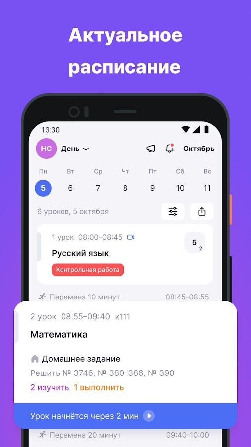 • Единое расписание уроков и дополнительных занятий в школе, запланированные школьные и личные события;