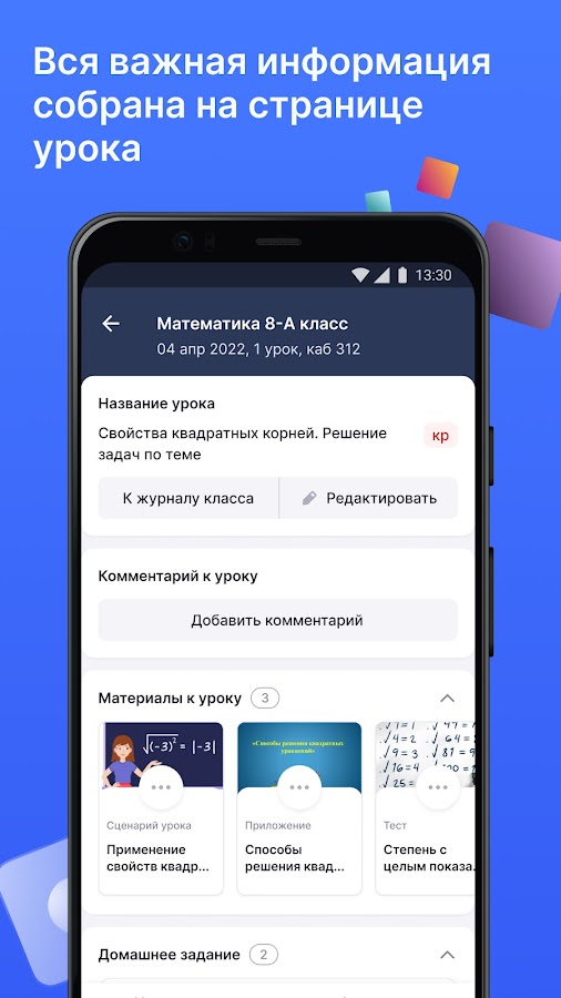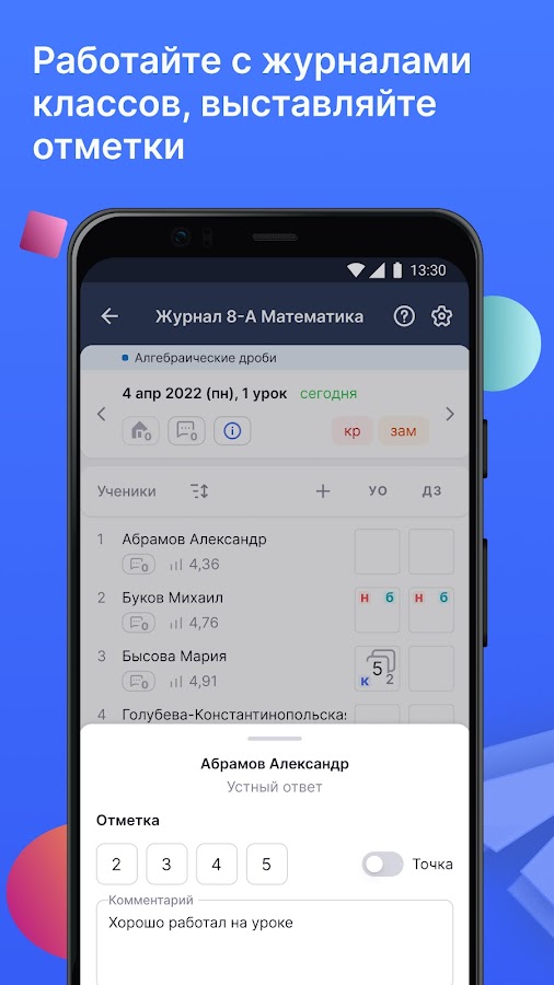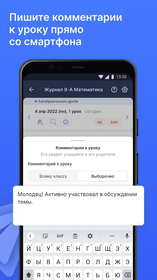 • Работать с журналом класса, оперативно вносить данные об успеваемости и комментарии к оценкам;