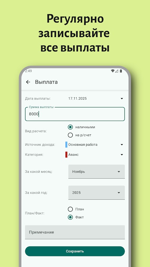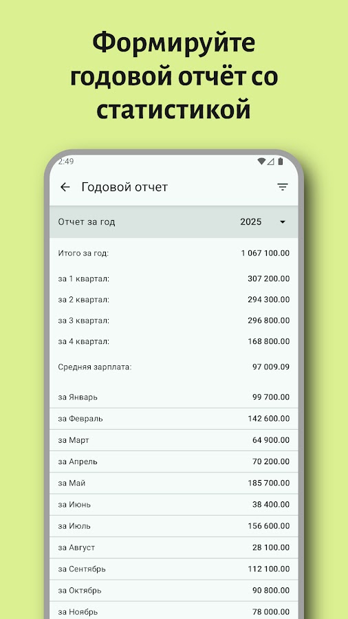 Просто начните пользоваться этим приложением, своевременно заносите каждую выплату, и в скором времени у Вас появится ясное понимание Вашего среднегодового дохода. Расходы времени на внесение информации требуют минимума времени.