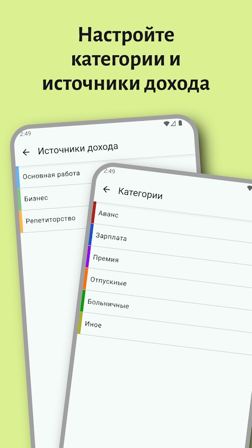 В приложении имеется возможность записи доходов по категориям и источникам дохода. Их можно редактировать и добавлять новые.