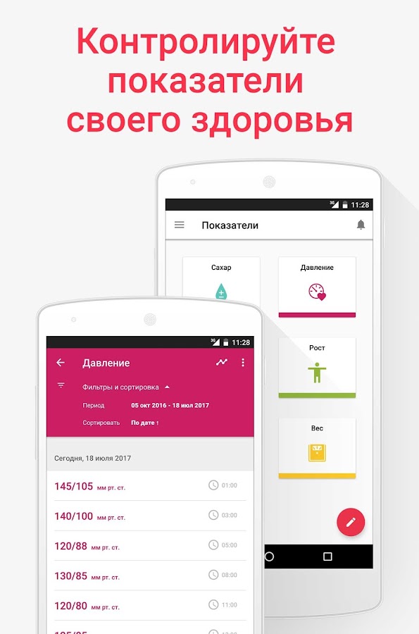 Наше приложение поможет вам ничего не упустить: будет вести график похудения (снижения веса), сохранять измерение пульса и давления. Глюкоза (сахар в крови) будет видна на отдельном графике, а не забыть про прием таблеток поможет встроенное напоминание. Будьте уверены: когда индекс массы тела придет в норму, о таблетках можно будет забыть!