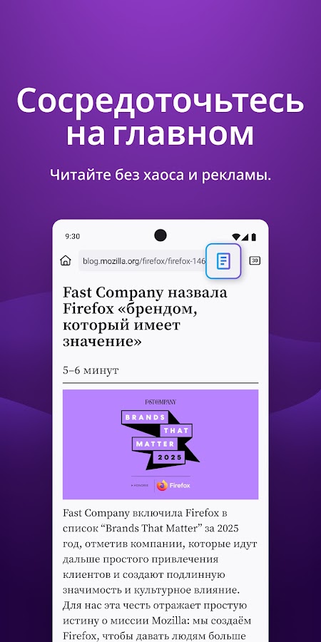 ✔ Режим для чтения – Сосредоточьтесь на чтении, убрав рекламу и всё лишнее со страниц.