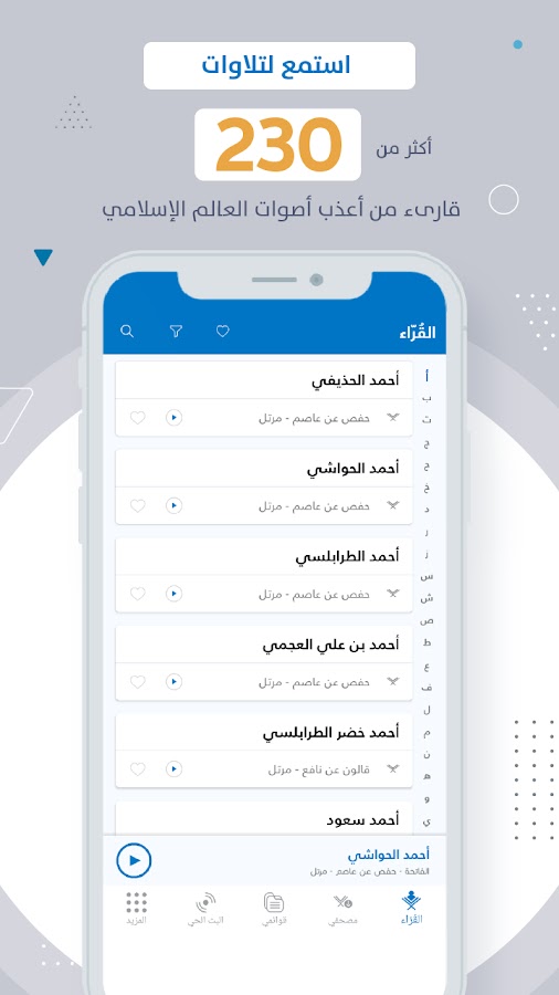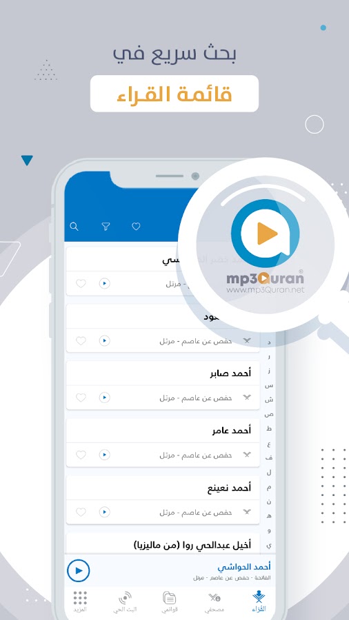 Это официальное приложение mp3quran.net, предлагающее чтение Корана более чем 230 известными чтецами. Приложение доступно на мобильных устройствах, планшетах, Android TV и некоторых устройствах Smart Watch.
