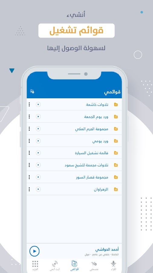 • Панель управления («Мой Мусхаф») для быстрого доступа к недавно воспроизведенным, последним выступлениям, загруженным выступлениям, записанным радиопередачам и спискам воспроизведения.