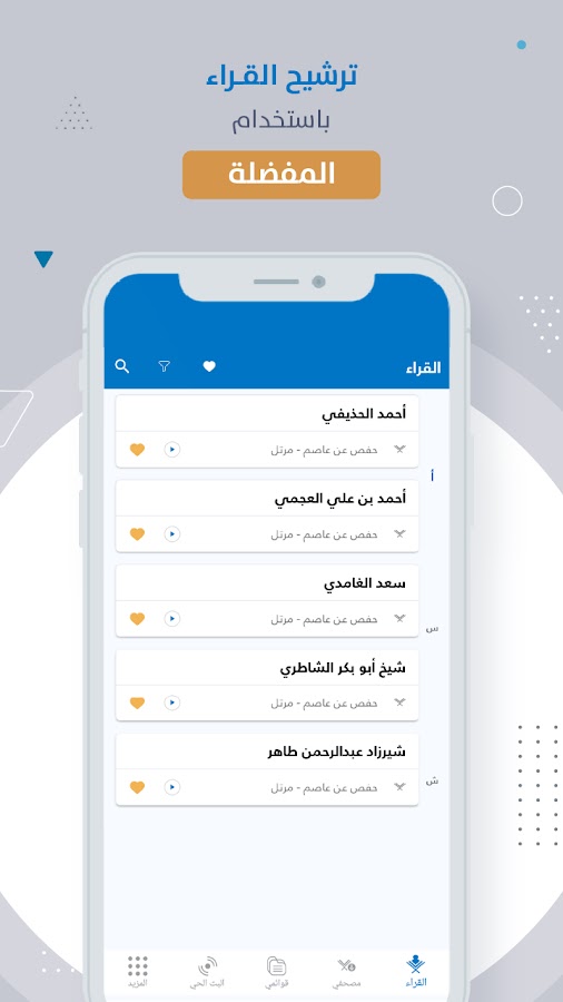 • Опция фильтра для фильтрации декламаций на основе повествований «Ривайат» (Хафс, Варш, Калун, Аль Дури…).