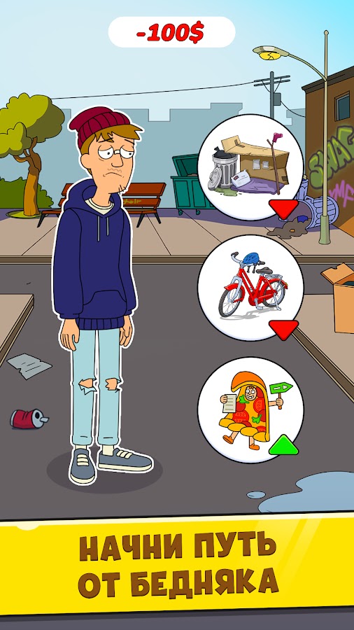 Всегда мечтал выбиться из грязи в князи и стать богачом? В этом тебе поможет симулятор реальной жизни бомжа «Mr. Billion»! Ты сможешь пройти весь путь к успеху с нуля от бедняка до миллионера или даже миллиардера. Делай сложный выбор и принимай решения, добивайся успеха и взлетай по карьерной лестнице. Эта бизнес игра даст тебе возможность заработать серьезные деньги и стать самым богатым и влиятельным!