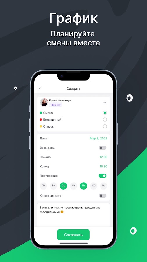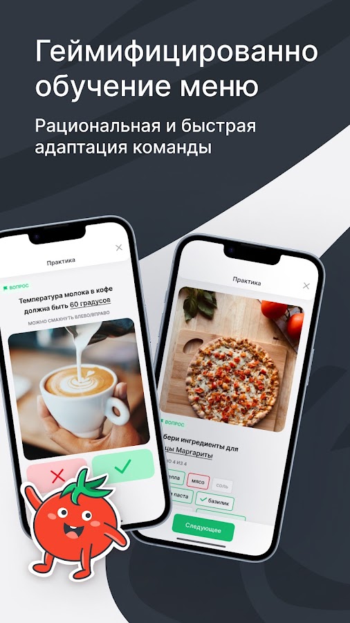Наблюдайте, как ваша команда прогрессирует вместе с Mr. Tomato. Теперь новые сотрудники будут учиться на 80% быстрее с помощью автоматически сгенерированных тестов на основе вашего меню, бар-меню и стандартов обслуживания. Кроме того, каждый сотрудник будет иметь свою роль и соответствующие уровни доступа, а цифровая экосистема обеспечит удобную коммуникацию, четкое планирование.