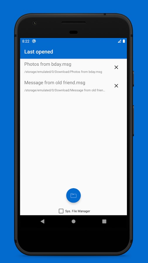 Чтобы открыть файл eml или открыть файл msg, просто используйте встроенный или системный файловый проводник, чтобы найти его. В проводнике файлов для чтения EML отображаются только поддерживаемые форматы, поэтому вы не потеряете внимание. Нажмите на кнопку с кружком в правой части экрана, чтобы открыть менеджер и найти свои файлы!