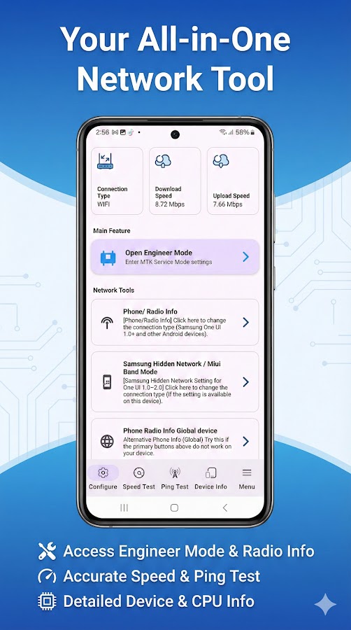 • Прямой доступ: Мгновенный доступ к скрытому сервисному режиму MTK и режиму Engineer без необходимости ввода сложных кодов.