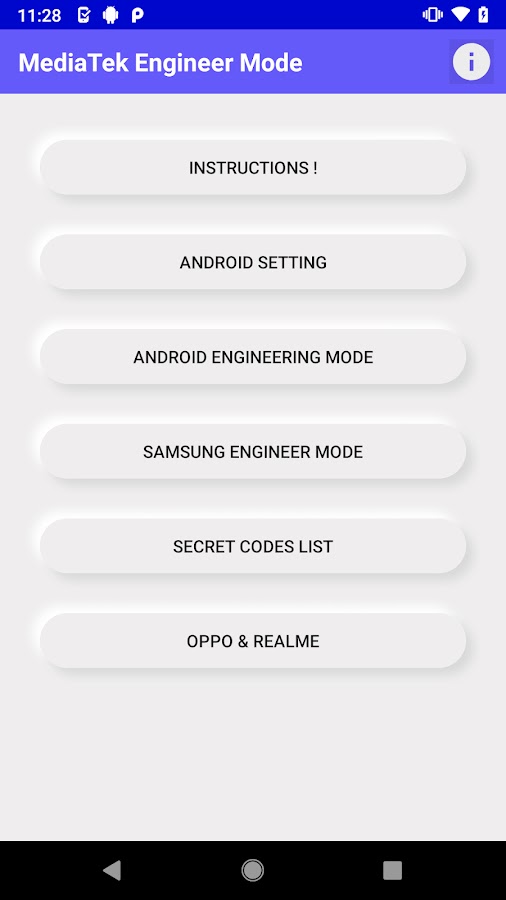 Он очень прост в использовании и очень быстрый доступ. и получите очень простой Инженерный режим с помощью этого приложения на вашем устройстве, которое поддерживается MTK (MediaTek). Вы можете легко получить доступ к Инженерному режиму, набрав * # * # 3646633 # * # * на клавиатуре набора номера или выполнив поиск на google.com для пример («секретный код инженерного режима андроид мобайл»). Это приложение не имеет доступа к информации на вашем мобильном телефоне.