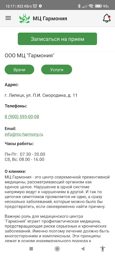 Официальное приложение Медицинского центра Гармония (г. Липецк). Адреса и телефоны, график работы клиники. Всегда актуальная информация о специалистах, расписание приема, запись на прием с выбором удобной даты и времени, просмотр истории обращений, результатов анализов и обследований, отзывы. Оплата услуг банковской картой прямо из приложения с учетом индивидуальных скидок. Информация и уведомления от клиники.