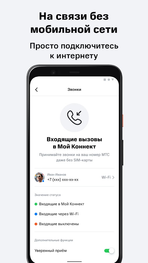 Мой Коннект – инструмент для тех, кто хочет использовать wifi звонки, звонки через интернет, кто много звонит на МТС или часто общается с близкими в роуминге. При подключении к Wi-Fi можно звонить куда угодно, и мобильная сеть вам совсем не понадобится.