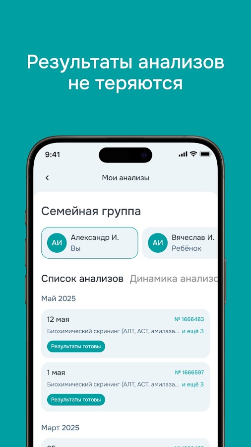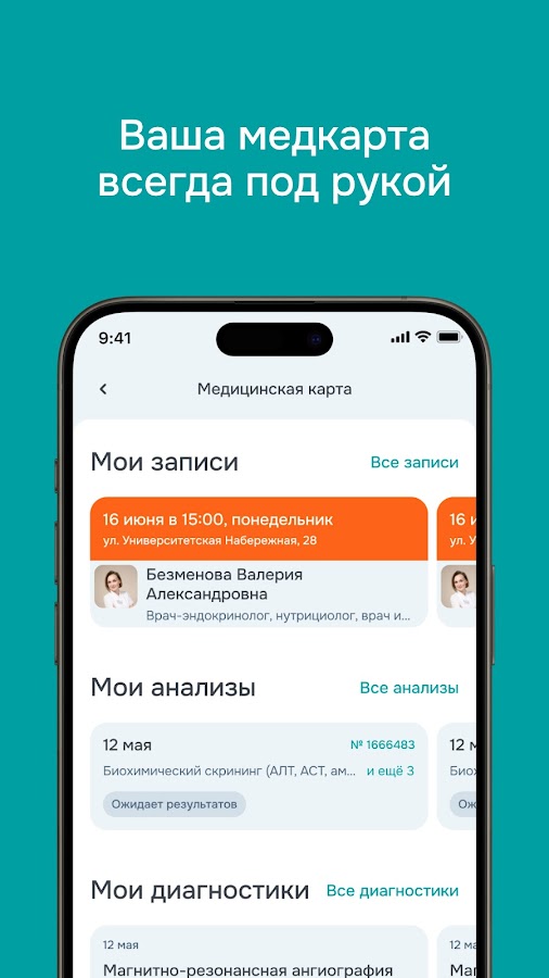 Приложение помогает быстро записаться на приём, хранить и просматривать результаты анализов и диагностик, отслеживать динамику показателей и заботиться о здоровье всей семьи — без очередей и бумажной рутины.