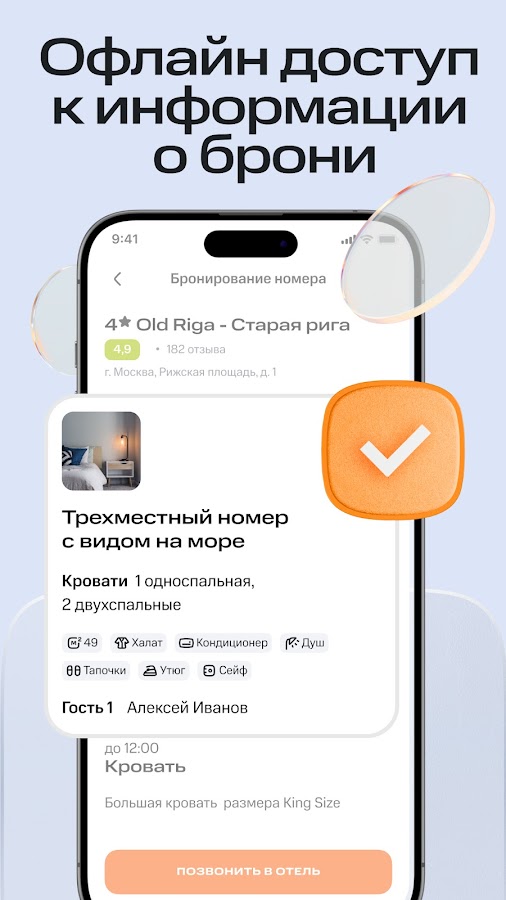 Осуществить поиск отеля в 170+ странах мира, арендовать онлайн на сутки или любой другой срок удобное жилье — всё это возможно с нашим приложением.