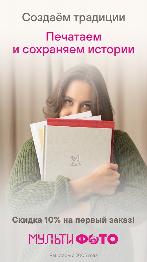 С 2005 года делаем фотопечать доступной для миллионов людей. В 2019 году мы произвели 3,7 млн. единиц фотопродукции — 98% клиентов довольны качеством! Печатаем любой заказ без предоплаты. Оплачивай только хорошие снимки. Не устраивает качество, не плати. Храни фотографии у нас. Печатай фотографии в любой момент. Бесплатно перепечатаем брак. Мы признаем ошибки. Напечатаем заказ заново в случае брака или потери. 100% анонимность. Производство автоматизированно. Никто не увидит твои снимки. Высокое качество печати. Крупнейшая фабрика в Восточной Европе, современное дорогостоящее оборудование. Доставим в твой город. 6000+ населенных пунктов доставки по России. Близкие в другом городе? Доставим без проблем.