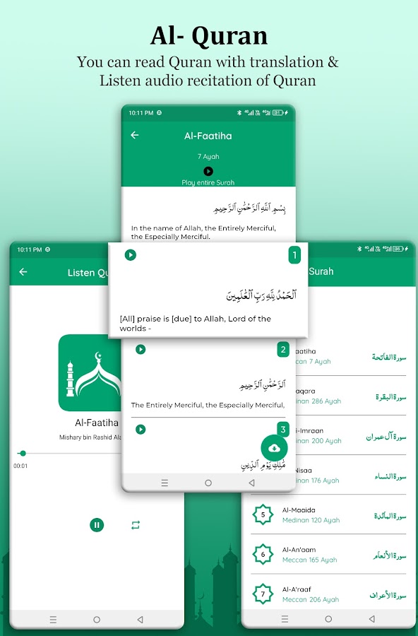 Это приложение включает Коран с переводом. Вы можете прочитать Коран и прочитать его чтение для поиска внутреннего мира.
