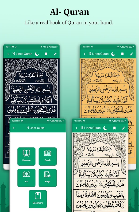 Это приложение представляет собой часть нумерации страниц Корана, и вы предлагаете впечатление, полученное от настоящего примера в вашей сети. Le mode nuit, la couleur des Pages et la couleur de la Police sont également, доступный для облегчения лекции Корана, de jour comme de nuit.