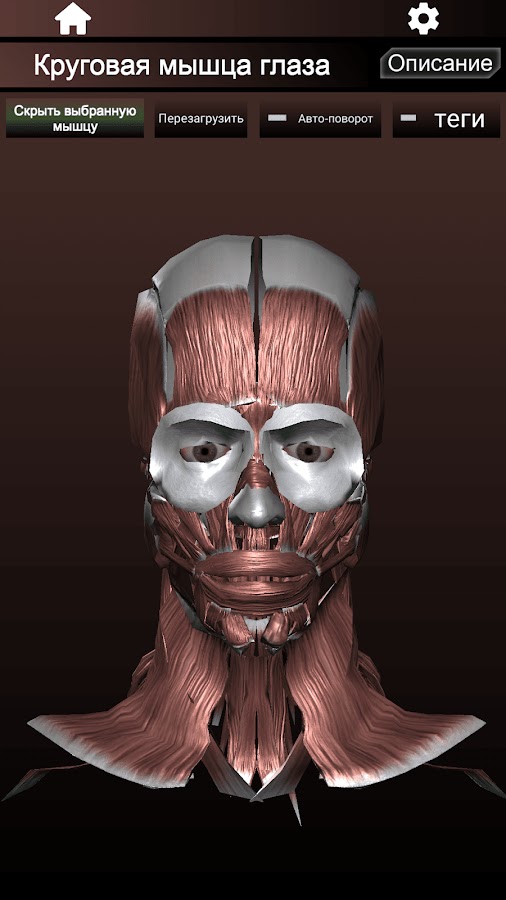 Показывает трехмерные модели мышечной системы и описание каждой мышцы в организме человека. Нажатие мышцы пальцами, он покажет информацию о correspondiente.